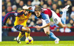 12月27日,在英超联赛第19轮比赛中,阿森纳队客场以2比2战平阿斯顿维拉队。图为阿森纳队亚历山大·宋(左)与阿斯顿维拉队彼得罗夫拼抢。 新华社发