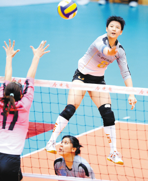 | 上海女排队员张磊(右上)在比赛中扣球。