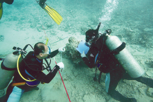 | 考古队员对华光礁Ⅰ号船板进行水下绘图。