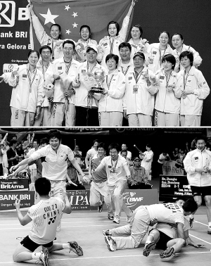 | ↑(4)中国羽毛球队再度包揽汤尤杯 5月在雅加达举行的羽毛球汤姆斯杯和尤伯杯比赛中,中国羽毛球女队连续第五次卫冕尤伯杯,中国男队连续第三次捧起汤姆斯杯。图为中国男队庆祝胜利。 |