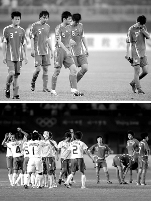 | ↑(8)“国字号”足球队战绩不佳 中国男足在南非世界杯亚洲区预选赛中止步20强。在奥运会上,中国国奥队三战皆负,仅进一球;中国女足在四分之一决赛中被淘汰。图为中国队球员在世界杯预选赛中黯然退场。 |