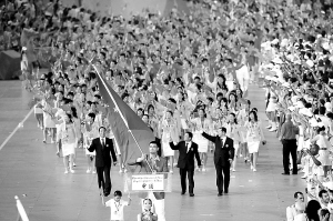 | ↓(7)中国队首次列奥运会金牌榜首位 中国体育代表团在北京奥运会上取得了51枚金牌、100枚奖牌的优异成绩,第一次名列奥运会金牌榜首位。图为中国代表团在北京奥运会开幕式上入场。 |