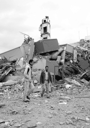 12月29日,两名巴勒斯坦人查看加沙伊斯兰大学内被摧毁的建筑。以军战机28日午夜空袭了位于加沙城内的伊斯兰大学,目前尚不清楚人员伤亡情况。 新华社/法新