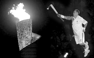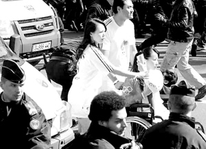 | ↑ 勇护圣火 4月7日当奥运火炬传递到法国巴黎站时,双腿有残疾的火炬手金晶被“藏独”分子突然袭击,勇敢的金晶毅然捍卫着火炬,不让对方碰到神圣的火炬。即使藏独分子拼命打她,金晶也咬牙护卫着火炬,这位上海姑娘的勇敢举动在第一时间通过网络被传回到国内,人们在愤怒抨击捣乱分子的所作所为之时,也为金晶大无畏的举动而深深感动。她被誉为“最美火炬手”。 |