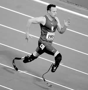| ↓ 刀锋战士 素有“刀锋战士”之称的南非田径运动员皮斯托留斯在2008年的知名度或许并不比博尔特差多少,身残志坚的他为了实现与健全人同场竞技的奥运夙愿,在赛场内外付出了巨大的心血。在2008年的北京残奥会上,“刀锋战士”更是拿下100米、200米、400米3枚金牌。皮斯托瑞斯生来缺少腓骨和踝骨,11个月大时便被截掉了膝盖以下的腿部,装上假肢的他获得“刀锋战士”的称 |