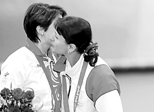 | ↑ 和平之吻 8月10日奥运会女子10米气手枪决赛中,中国小将郭文夺冠,俄罗斯选手帕德琳娜和格鲁吉亚选手萨卢克瓦泽分获银牌和铜牌。当时俄罗斯和格鲁吉亚因为南奥塞梯问题爆发战争,作为来自两国的运动员,帕德琳娜和萨卢克瓦泽在颁奖台上拥抱亲吻,感动了全世界。萨卢克瓦泽向全世界发出和平宣言:“如果世界人民要从我们的所做所为中学到什么,那便是不应该有战争 |
