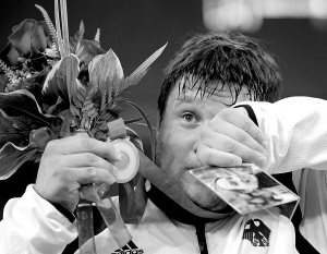 | ↑ 感人之吻 毫无疑问这也是奥运会上最让人感动的时刻,德国选手施泰纳拿着亡妻的照片来北京参赛,在男子105公斤以上级的比赛中,为了实现他和在天上的爱妻的约定,施泰纳最后一把上要了从没有举过的重量,额外的力量让他获得了成功。在夺冠后他默默祈祷,并拿出妻子照片吻个不停,而在颁奖典礼上,施泰纳饱含泪水又拿出了妻子的照片和金牌合影,他完成了人世间最� |