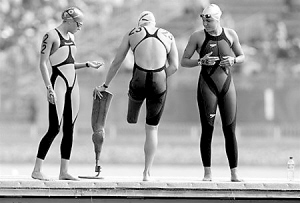 | ↑ 单腿勇将 在北京奥运会女子10公里游泳比赛中,最动人的一幕是南非选手娜塔莉·杜托伊特。尽管她只有一条腿,但是她仍然完成了比赛,并在25名选手中名列第16名。2001年,17岁的娜塔莉突然遭遇车祸,丧失了左腿。但手术5个月后,她就跳进泳池,重新寻找自我。2007年非洲运动会上,她夺得女子800米自由泳金牌;2008年5月,她在世锦赛上夺得女子10公里马拉松游泳第4名,一举� |