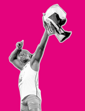 | ↓ 跑道闪电 2008年世界体坛的各种评选,如果缺少了博尔特,那就是没有意义的评选,他在北京奥运会上夺得三枚金牌,打破100米和200米世界纪录。100米跑9秒69是很惊人的破纪录成绩,但博尔特在最后十米处刻意放慢速度,举手拍着胸脯冲线。牙买加人绝对有自豪的本钱,他证明了男子100米的极限速度依然由他来掌握。图为博尔特破纪录后摆出弯弓射大雕的招牌姿势。