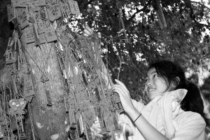 | 在南山的祈愿树下,一名华裔少女在心愿牌上写下自己的心愿。
