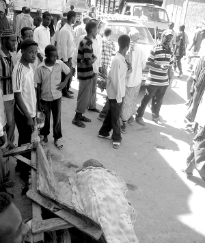 12月29日,在索马里首都摩加迪沙,当地居民在一具尸体旁观看。当天,索马里反政府武装在摩加迪沙与政府军和埃塞俄比亚部队发生多起激烈战斗。据当地医院的医护人员和目击者说,至少有10人在交火中死亡,另有19人受伤。 新华社发