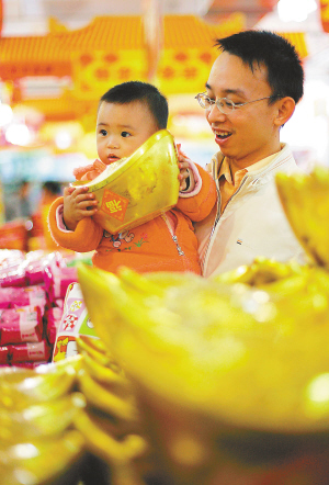 ↑1月1日,海口市府城天茂百货,一位市民带着孩子选购商品。 本报记者 张杰 摄