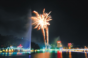 ↑1月1日晚,五指山夜空礼花绽放。五指山市委、市政府在美丽的南圣河畔举办一场焰火晚会迎新年。 特约记者 尹秋艳 摄