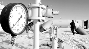 | 1月1日,在乌克兰首都基辅附近的博亚尔卡,一条天然气管道上的气压表读数显示为零。