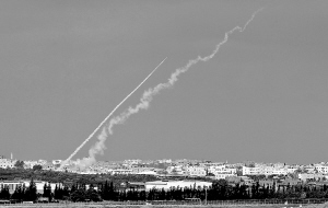 2日,巴勒斯坦武装人员从加沙北部发射的火箭弹拖着尾烟飞向以色列目标。在过去几天里巴武装人员向以发射了300多枚火箭弹,共造成4人死亡。 新华社/法新