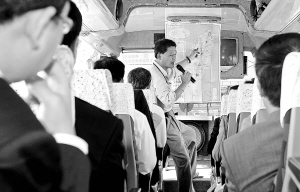 | 台湾导游施绍华展开地图向游客介绍台湾概况。 |