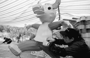 1月4日,在海口市万绿园,工人们正在制作牛生肖造型彩灯,以迎接第四届海口市万春会。 第四届海口市万春会16个主题活动将从1月22日至2月9日春节期间在万绿园轮番举行。 本报记者 张杰 摄