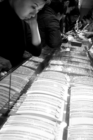 1月2日,顾客在北京一家首饰店里选购黄金饰品。据了解,这家商店元旦期间一天首饰饰品销售营业额达500多万元,是平时的5倍。 新华社记者 高学余 摄