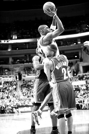 | 1月4日,在NBA常规赛中,华盛顿奇才队主场以80比77战胜克里夫兰骑士队。图为华盛顿奇才队球员贾米森(上)在比赛中突破投篮。新华社发 |