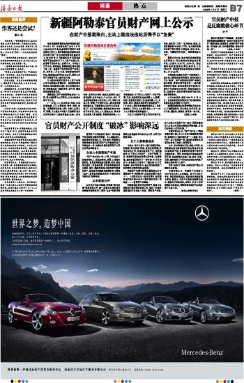 地处祖国版图最西北角的阿勒泰地区于今年1月1日如期兑现了去年5月25日出台的《关于县(处)级领导干部财产申报的规定(试行)》,在阿勒泰地区纪律检查委员会等三部门主办的阿勒泰地区廉政网上,对2008年12月新提任的55名副县级领导干部全部进行了个人财产申报公示,各领导干部的年收入差距不大,年均在3万元左右。按照规定,阿勒泰地区同时启动了县(处)级领导干部的首次财产申报工作,并将在1月20日后,对申报材料进行审查,陆续通过该网向社会公开,届时公示财产的领导干部人数将会大增。