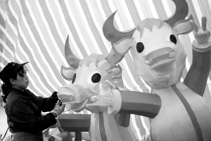 | 2009年1月4日下午,在海口市万绿园,工人们正在制作牛生肖造型彩灯。牛年第四届海口市万春会从1月1日至2月9日在万绿园举行,将为广大市民提供丰富多彩的文体活动。 本报记者 张杰 摄 |