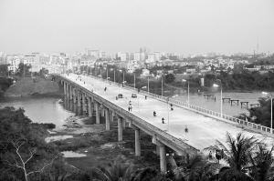路灯已先放光明 经过工人夜以继日的奋战,位于琼海市嘉积镇万泉河游览区的嘉积大桥改建工程已经进入收尾阶段。新改建的嘉积大桥总投资3720多万元,全长530米,宽24米,双向6车道。目前大桥上已经允许小型车辆通行,春节前正式通车。 1月4日,大桥两侧新安装的46盏路灯已开始大放光明。 特约记者 蒙钟德 摄