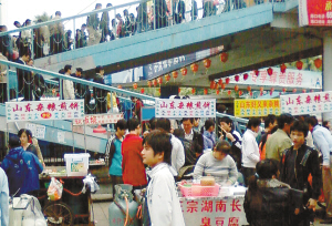 在南宝路和明珠广场,记者看到,10多个卖臭豆腐、山东大饼、海南酸菜、特色饮料的摊点,把路堵得水泄不通。散发在空气中的臭豆腐的臭味,令人作呕,大英天桥下更是被卖粗粮火烧、山东大饼的摊点层层包围,行人要在摊点间侧身通过,再加上节日放假出行市民增多等因素,整个明珠广场、南宝路、海秀路一带人流、车流、地摊一片杂乱。