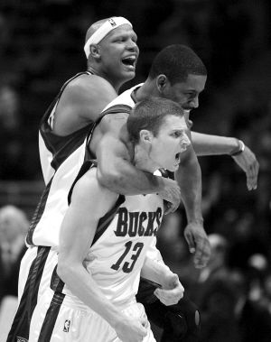 1月5日,在NBA常规赛中,雄鹿队主场以107比97战胜猛龙队。图为雄鹿队球员里德诺(前)在终场前投中三分球后,与队友庆祝。 新华社发