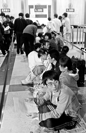 | →1月6日晚上10时许,海口火车站售票大厅,海南师范大学内地籍学生排队购买第二天早晨7点开始销售的学生票。学生们利用排队的时间复习功课迎接期末考。 本报记者 李英挺 摄