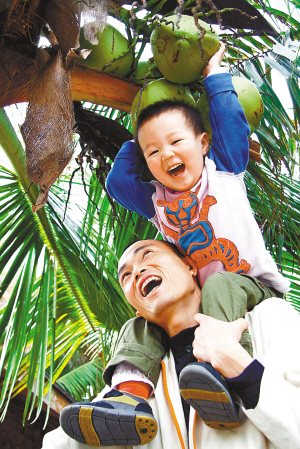 记者1月6日从三亚市旅游局了解到,1月1日在亚龙湾举行的2009中国生态旅游年启动仪式,使三亚的生态游备受追捧。连日来,到三亚“走进绿色旅游,感受生态文明”的游客络绎不绝。仅三亚南山景区,1月1日至6日游客已突破5万人次。图为1月6日,南山景区内,四川游客张先生和儿子一起与椰子亲密接触,感受海南的生态魅力。 本报记者 程范淦 通讯员 陈文武 摄