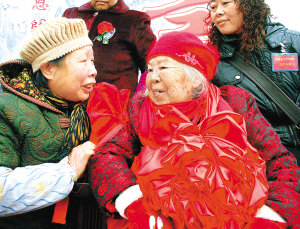 重庆 1月6日,村民向百岁老人彭高楷祝寿。 1月6日是重庆市荣昌县岚峰村孤寡老人彭高楷的百岁寿辰。当地企业和群众自发捐款为老人举办寿宴,数千村民赶来为她祝寿。据介绍,彭高楷老人一生没有子女,在邻居杨国明和其他村民的照顾下,老人目前身体健康。 新华社发(朱芸锋 摄)
