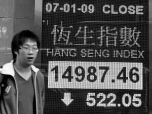 1月7日,一位市民从香港湾仔恒生指数电子显示屏前走过。 当日,香港恒生指数下跌522.05点,收报14987.46点,跌幅为3.37%。 新华社记者 吕小炜 摄