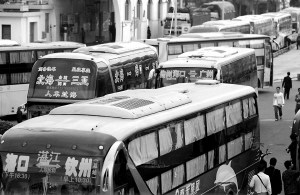 → 1月6日下午,海口秀英客运码头,客运长途车正准备过海。 本报记者 张杰 摄