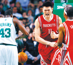 | → 1月7日,在NBA常规赛中,休斯敦火箭队客场以89比85战胜凯尔特队。图为休斯敦火箭队球员姚明(中)在比赛中。