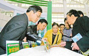 | 稻博会上,国内客商在比较各种优质大米。 本报记者 李英挺 摄 |