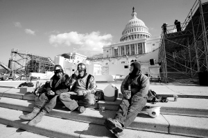 1月9日,在美国首都华盛顿国会大厦的西侧台阶上,负责安装总统就职演说讲台的工人们在休息。当选总统奥巴马的就职典礼将于1月20日在这里举行。 新华社/路透