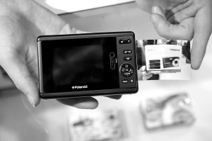 1月9日,在美国内华达州拉斯韦加斯举办的电子消费展上,一名工作人员展示宝丽来公司新近推出的“数码拍立得”———Pogo相机。宝丽来公司1月8日开始发售这种内置打印机的Pogo相机,并称其为“70年代起就广受欢迎的拍立得相机的数码版”。 新华社/法新
