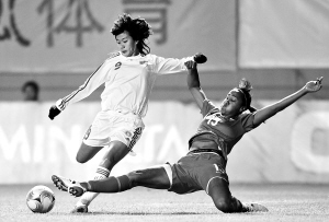 1月10日,在广州举行的2009年四国女足锦标赛上,中国队4:0胜新西兰队。图为中国队球员韩端(左)在比赛中与对手拼抢。 新华社发
