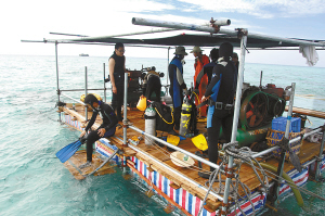 | 考古队员在海上工作平台整理压缩空气瓶准备下水。本版图片由西沙水下考古队提供 |