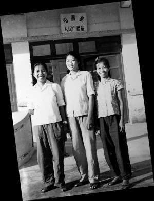 ②1975年在屯昌广播站工作的王曙鸿(中),衣着朴素。