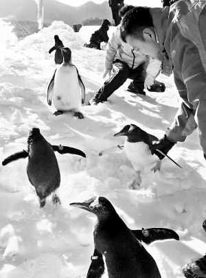 1月10日,在大连林海滑雪场,工作人员正试图让企鹅沿着雪地上开挖的雪槽行走。 当日,在大连林海滑雪场第二届全国大众杯滑雪比赛开幕式现场,6只前来助阵的企鹅任凭工作人员如何安抚引领,仍旧四处奔逃,不按设定路线“走台”,引得现场观众捧腹大笑。 新华社发