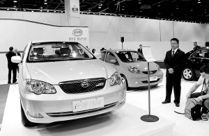1月11日,中国比亚迪汽车公司F3DM混合电动车(左)在美国底特律科博中心举行的2009北美国际车展上亮相。本届车展预计将发布约50款新车。 新华社发