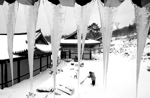 1月12日,在韩国南部济州岛的济州,一位和尚在打扫寺院内的积雪。近日,韩国遭遇大雪天气。 新华社/路透