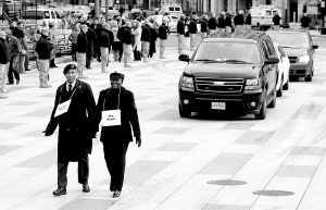 1月11日,分别扮演美国当选总统奥巴马及其夫人米歇尔的两名美军士兵在华盛顿举行的奥巴马就职典礼彩排中随车队走位。美国当选总统奥巴马的就职典礼将于1月20日在华盛顿举行。 新华社/路透