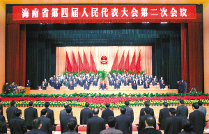 | 1月12日,海南省第四届人民代表大会第二次会议在省人大会堂隆重开幕。图为大会现场。 本报记者 宋国强 摄 |