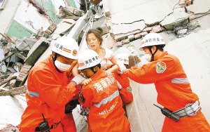 | ↑汶川特大地震灾害,海南第一时间派出救援队抵灾区。图为海南地震紧急救援队在灾区救灾的场面。