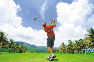 | ↑ 海南得天独厚的自然条件,为建设国际旅游岛打下坚实基础。图为外国游客在亚龙湾享受着高尔夫球度假的悠闲。
