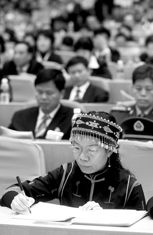 | ←少数民族女代表在认真听取政府工作报告。 本报记者 宋国强 摄 |