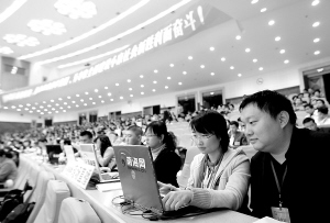 ←一位电视摄像记者在拍摄大会现场。 本报记者 宋国强 摄