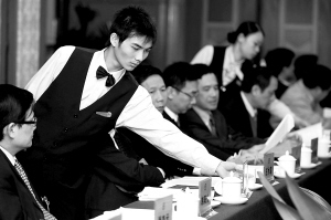↑1月12日下午,服务员黄宏宏正在为参加分组讨论的委员们添加茶水。为了尽量不影响会场的委员发言,他的动作总是小心翼翼。本报记者 王凯 摄